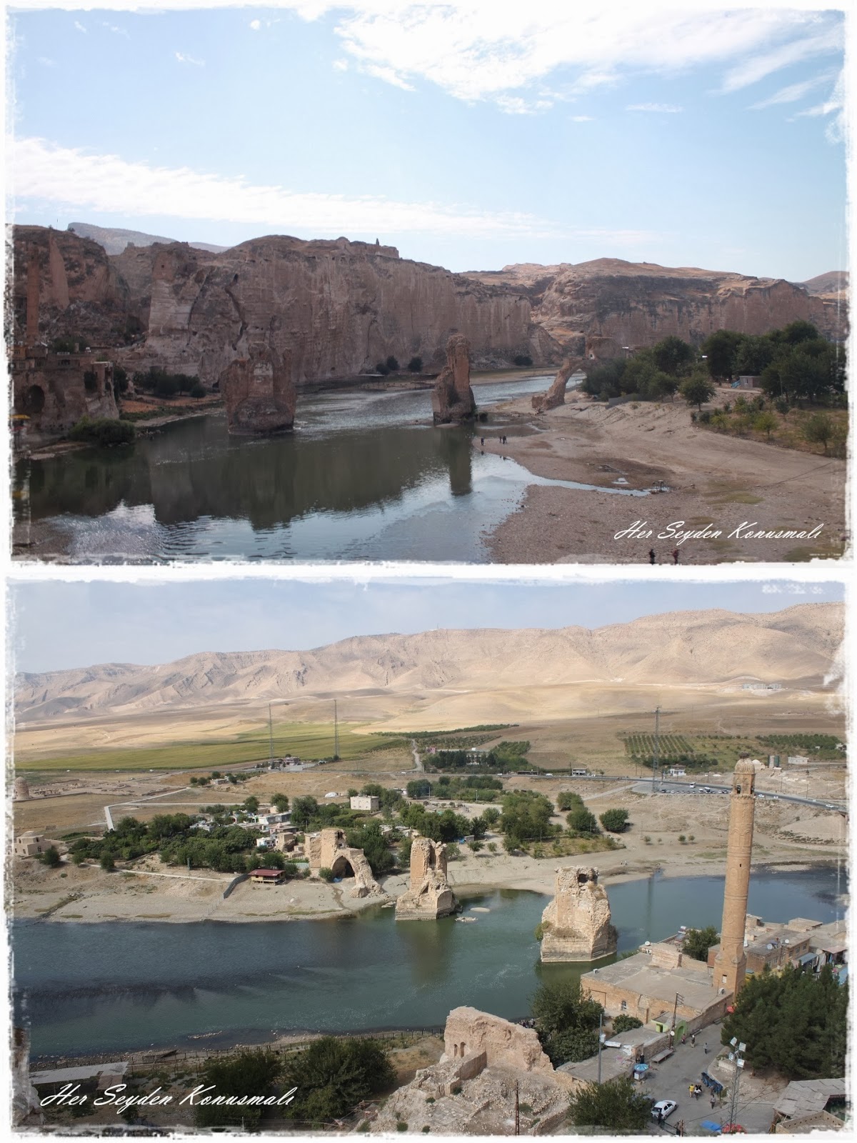 Dicle Nehri üzerinde gördüğünüz bu kalıntılar eskiden bir köprüymüş. Ele geçirilen bir kaynaktan öğrenildiğine göre köprü açılıp kapanabilme özelliğine sahipmiş. Açılıp kapanabilen bu ahşap bölüm, düşman şehre saldıracağı zaman açılarak düşmanın şehre girmesi engellenirmiş. Köprünün solunda yıkılmadan kalmış olan ayağının üzerinde bir ev var resme yakından baktığınızda göreceksiniz. Burada yaşayan ailenin taa Osmanlı'dan kalma tapusu varmış ve oradan çıkmak için oldukça yüklü bir para istiyormuş. Neden çıkıyorlar derseniz baraj yapıldığında suyun yüksekliği resimde gördüğünüz minarenin neredeyse tepesine kadar olacakmış.